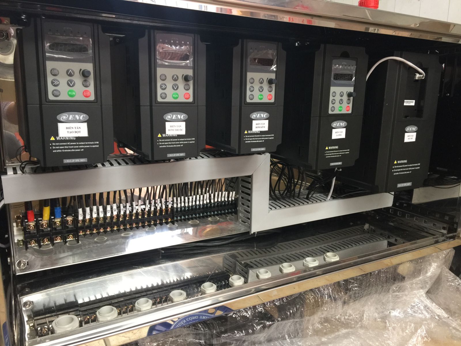 Hệ thống tủ điện được thiết kế theo yêu cầu riêng, tích hợp biến tần ENC chính hãng, có khả năng điều khiển tốc độ động cơ linh hoạt, giúp tối ưu hóa hoạt động của các thiết bị truyền động, giảm tiêu hao năng lượng và nâng cao độ ổn định của dây chuyền.